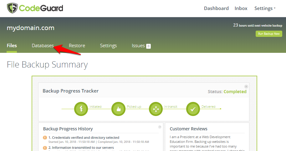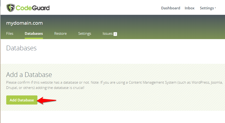 1. Visit the CodeGuard dashboard, as explained above in the process for adding a website. Click on the Databases tab.