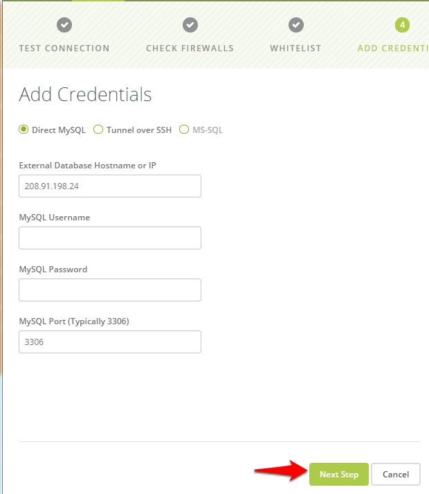 6. Enter the database username and password for the database you want to connect with CodeGuard. Click Next Step to proceed.database-username-password