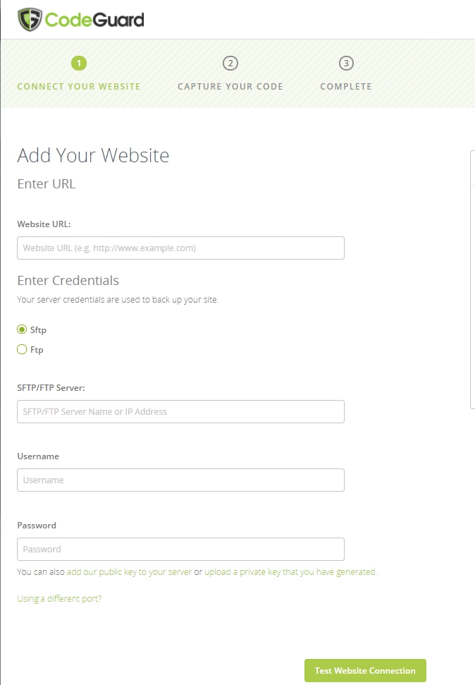 3. You will be required to add your website FTP details, if you are logging in to the CodeGuard dashboard for the first time. If you have the FTP details, proceed to step 4 directly.