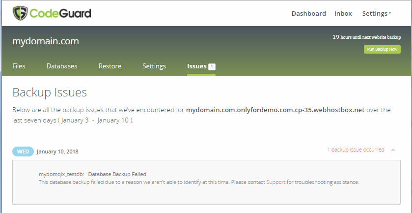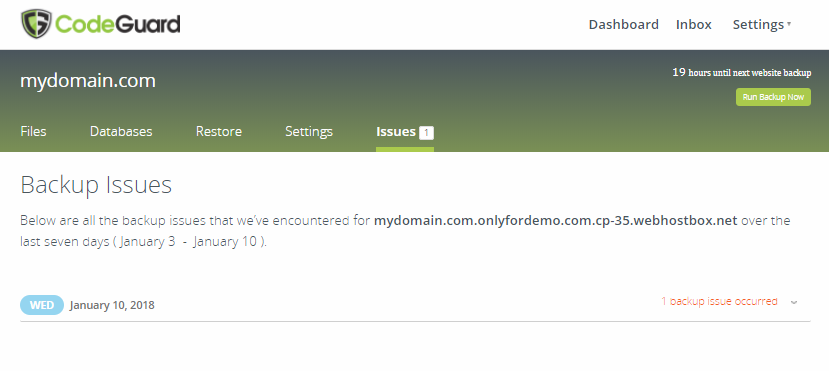 1. In the CodeGuard dashboard, click on the Issues tab to bring up the Backup Issues interface: