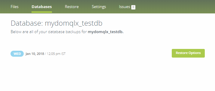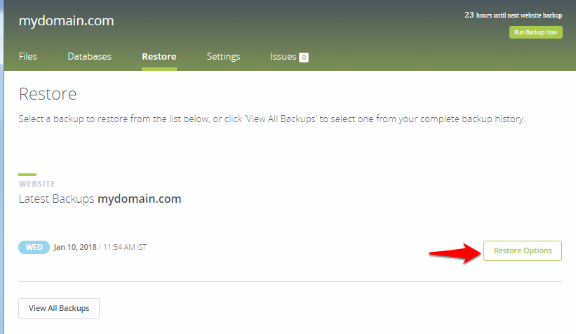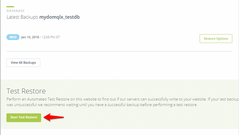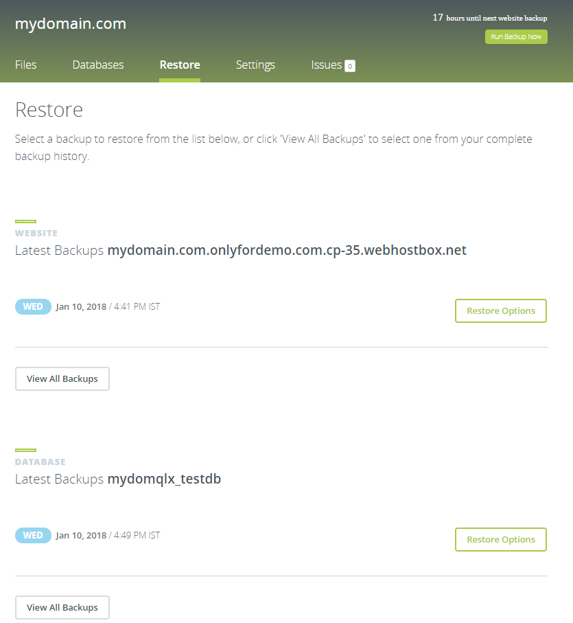 2. In the website / database specific view that follows, click on the View All button to view the backup history interface: