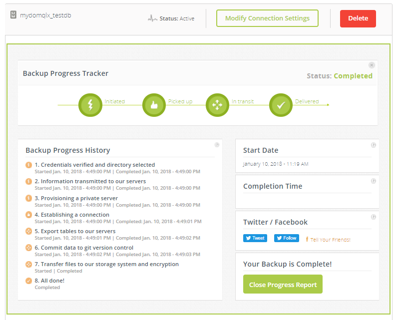 This completes the process of adding a website and a database to your CodeGuard account. CodeGuard will now regularly check your website and database and will take a backup if any changes are detected.