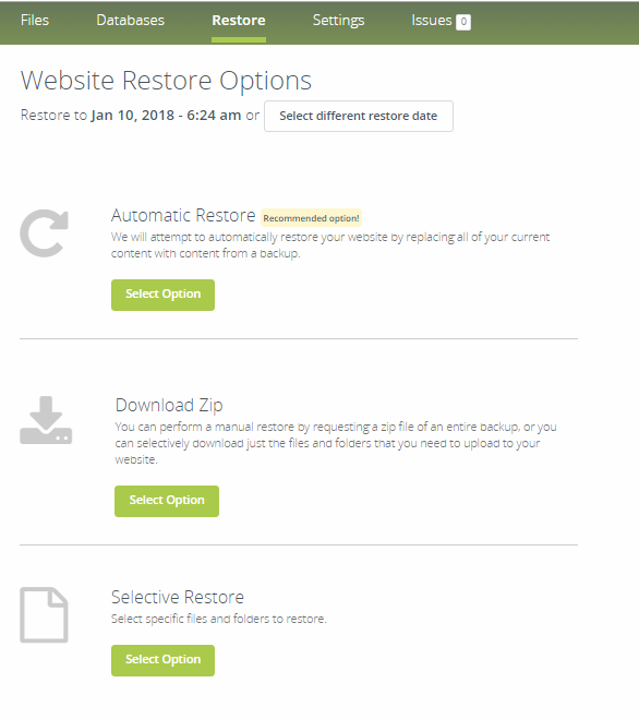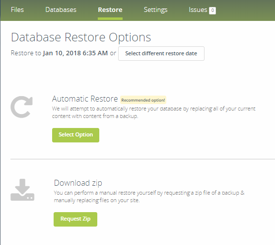 • Download Zip: Perform a manual restore yourself by requesting a zip file of a backup & manually replacing files on your site
