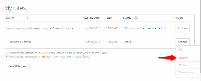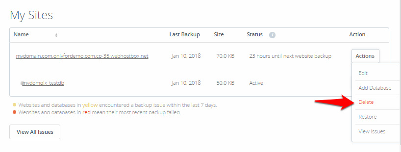 4. If required, you can delete a website or database through the Delete option under the ACTION menu, corresponding to the website or database.