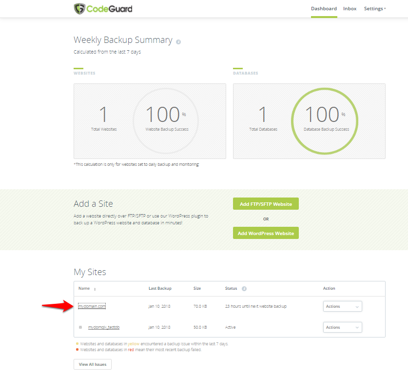1. In the CodeGuard dashboard, click on the website or the database link under My Sites.