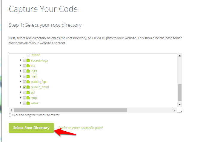 5. On a successful connection, you will see the screen shown below. Select the root directory of your website and click on the Select Root Directory button to proceed.