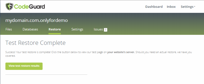 2. You can perform an automated test restore on your website to find out if CodeGuard can successfully write to your website, by clicking the Start Test Restore button.