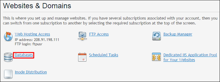 • Plesk: In the Plesk control panel, click on the Databases link.