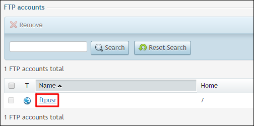 2. Under the FTP accounts section, click the FTP user link for an existing FTP user.