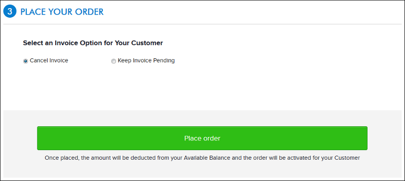 Once you place the Order, your total cost will automatically be deducted from your Account Balance and the Order will be activated for your Customer. System notifications will be sent to you and your Customer, as per your Email preferences.