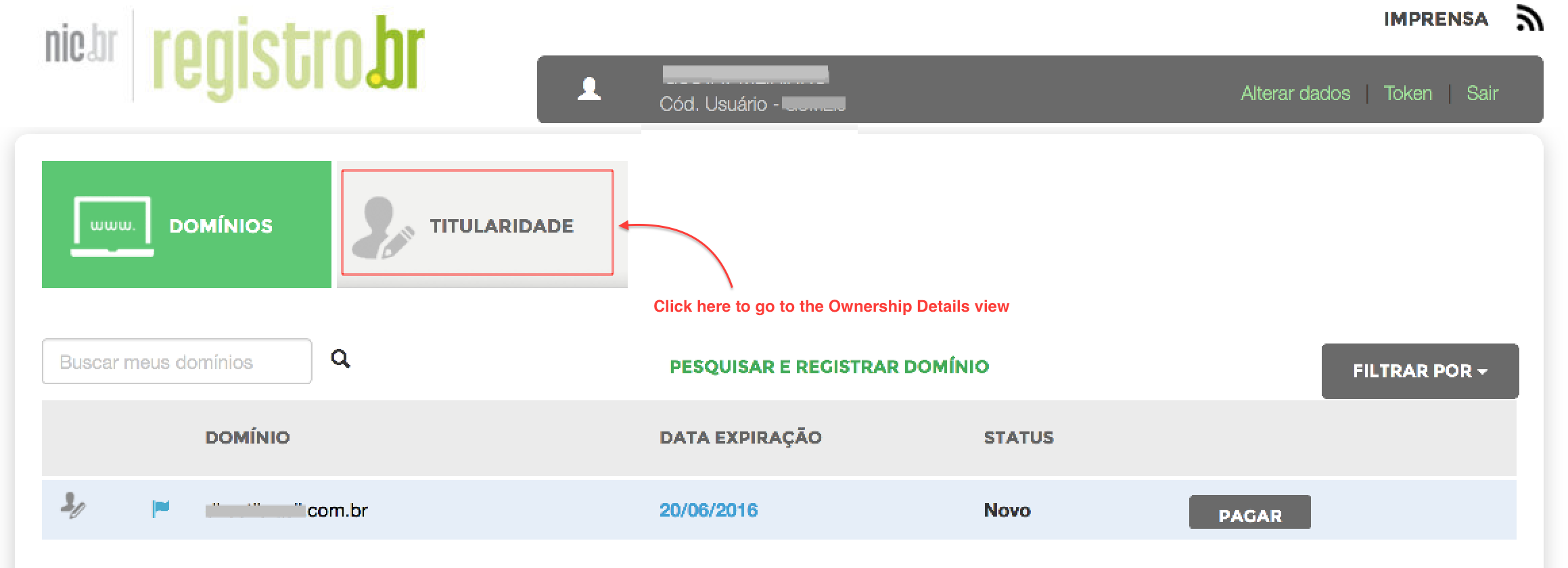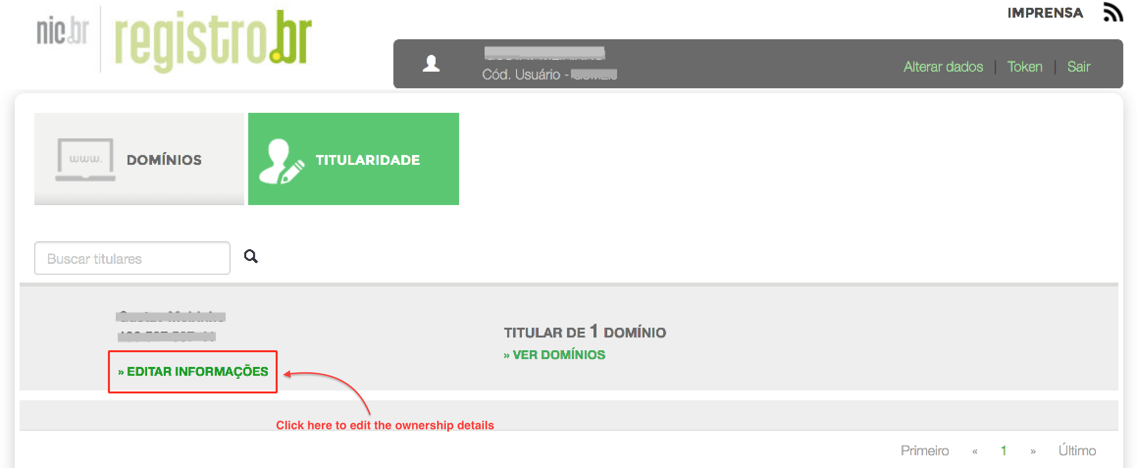 2. Once logged in, click on TITULARIDADE to go to the ownership details view.