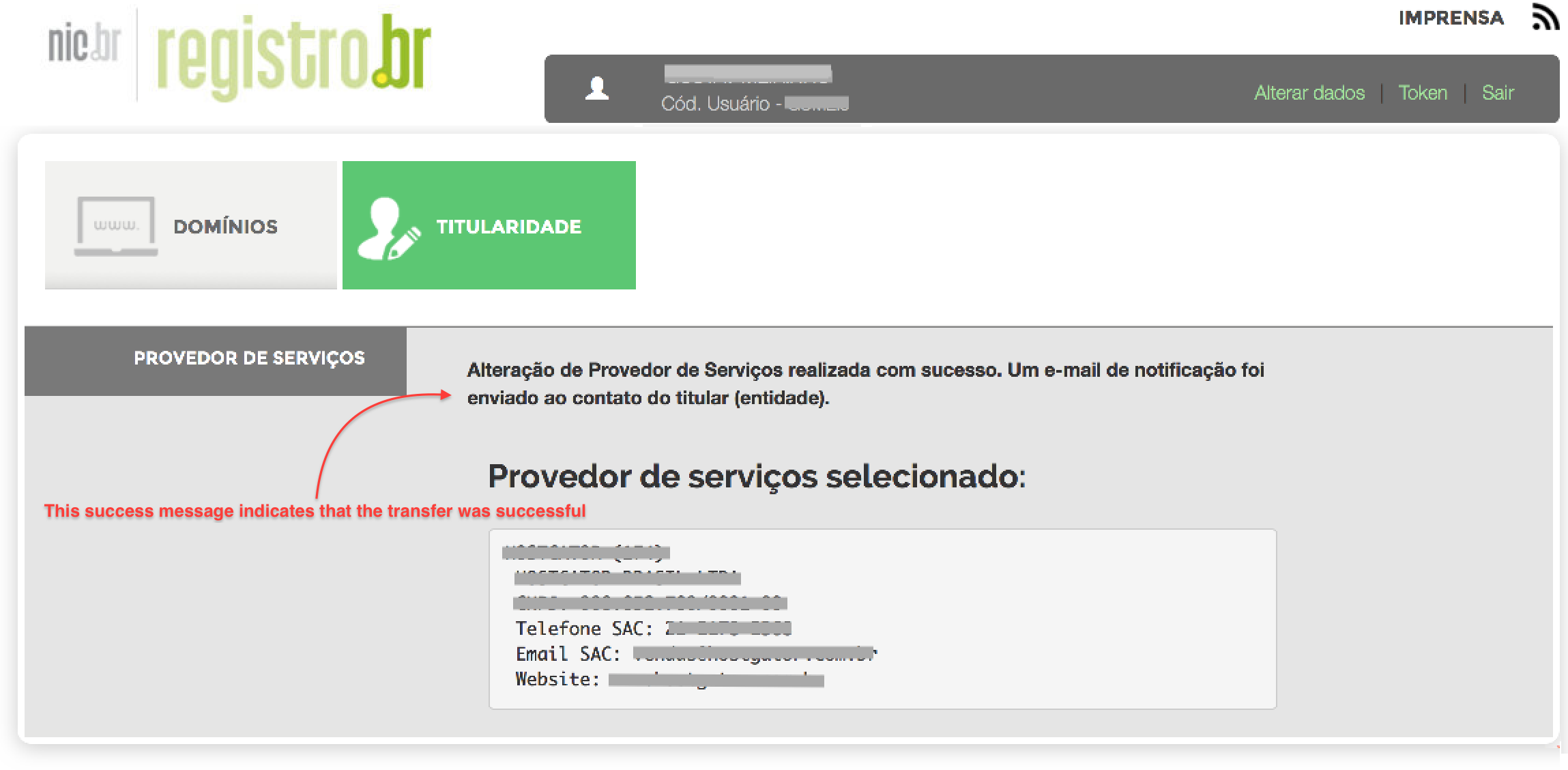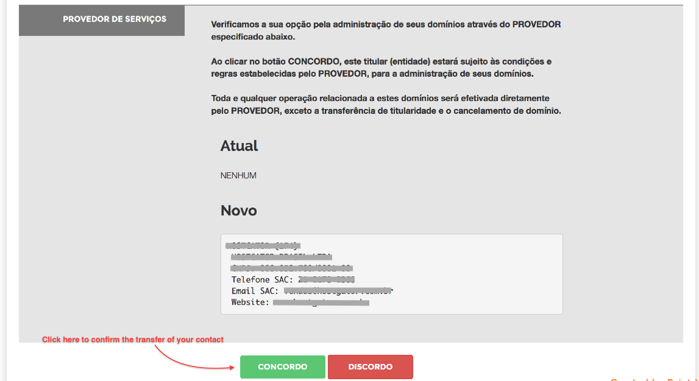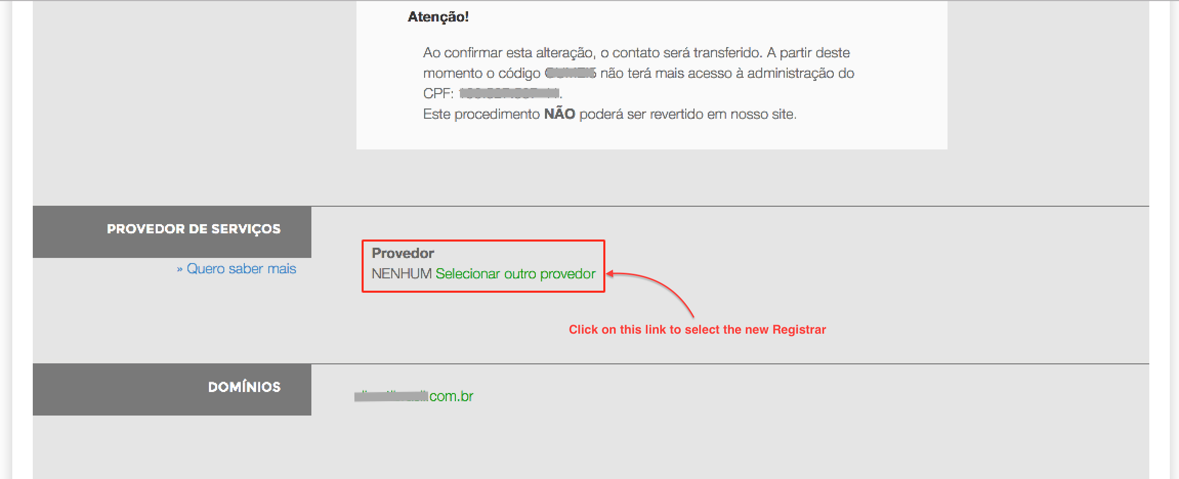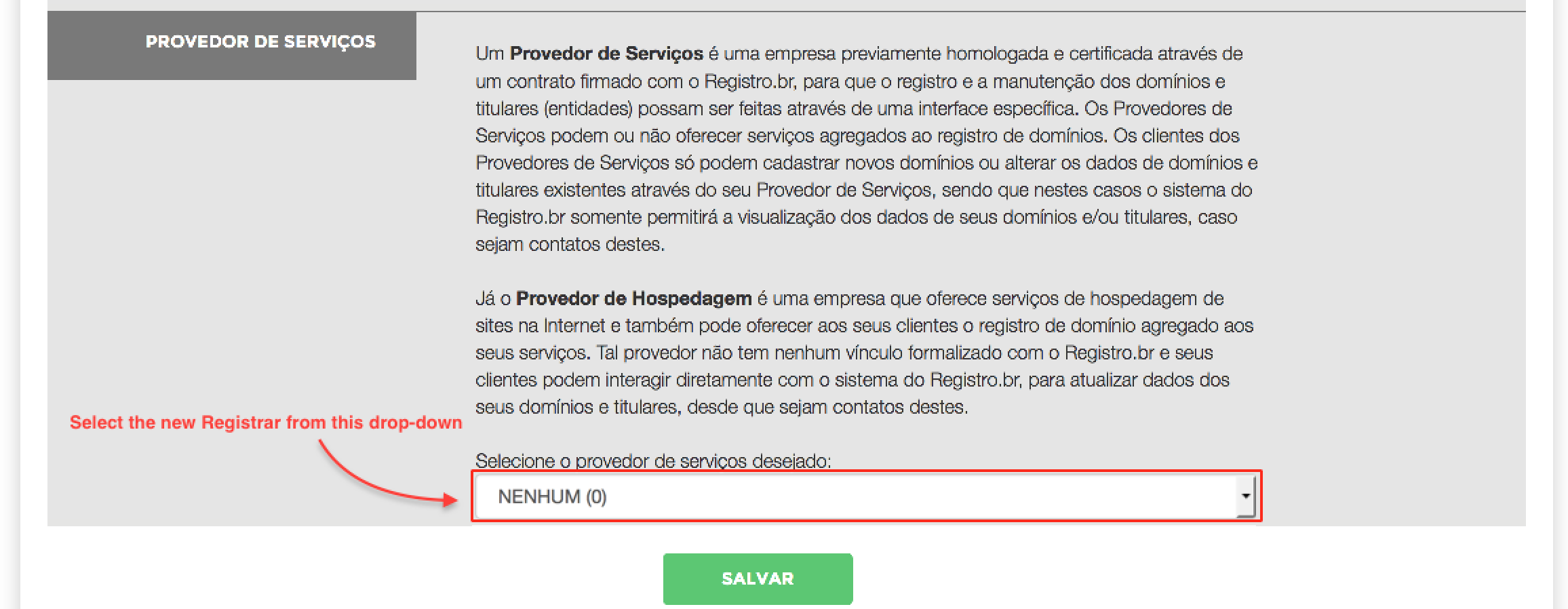 4. On this page, scroll down to the PROVEDOR DE SERVIÇOS section, where you can select the new Registrar.