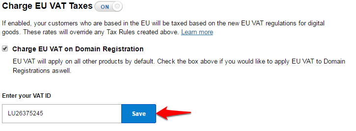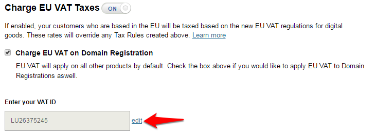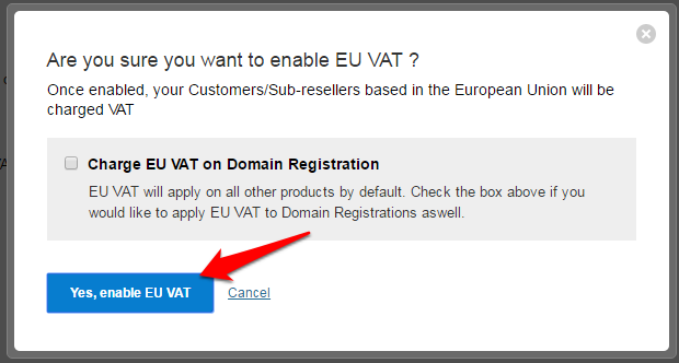 Click on Yes, enable EU VAT button to confirm. If you wish to charge EU VAT on Domain Registration as well, click on the check box next to Charge EU VAT on Domain Registration.