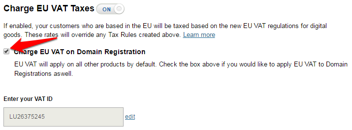 Uncheck the box next to Charge EU VAT on Domain Registration. to disable EU VAT for Domain Registration.