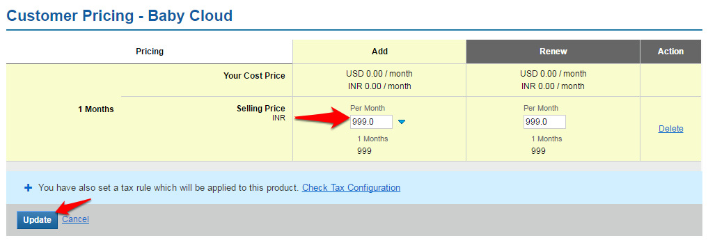 • Add the per month Selling Price and click on the Update button to save your changes.