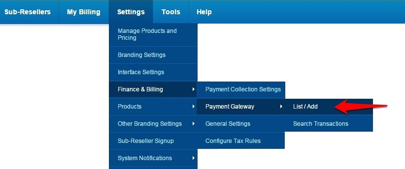 Click on Setting > Finance & Billing > Payment Gateway > List/Add.
