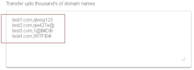 Domain Information: Enter each domain name on a separate line. Mention their respective Transfer Secret/Authorization Code on the same line as the domain name, separated with a comma.